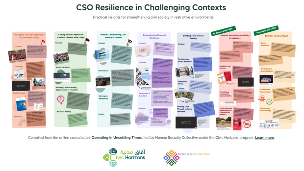 Under the Civic Horizons project, Human Security Collective conducted an online consultation with civil society organizations across Morocco, Tunisia, Libya, Iraq, Jordan, and Lebanon to better understand the dynamics of shrinking civic space in the region. The findings of this consultation were compiled in our report Operating in Unsettling Times, which sheds light on how the successive crisis impact everyday practices of civil society, how these are then topped by the restrictions CSOs face from governments and banks, as well as the growing administrative and compliance demands from donors and leads to a state of survivalism. The report also describes the ways organizations adapt, build trust, and pursue resilience.